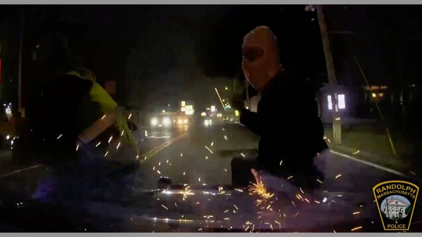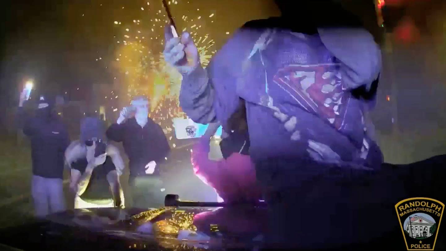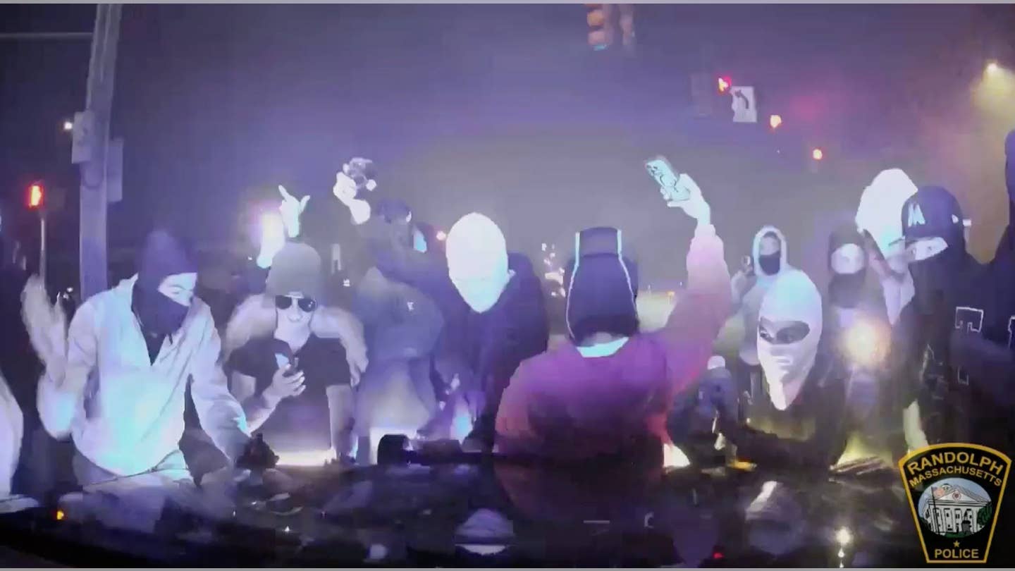 Dashcam footage of a street takeover in Randolph, Massachusetts from October 25, 2025 shows chaos as agitators jump on police cruiser. (Randolph Police Department)